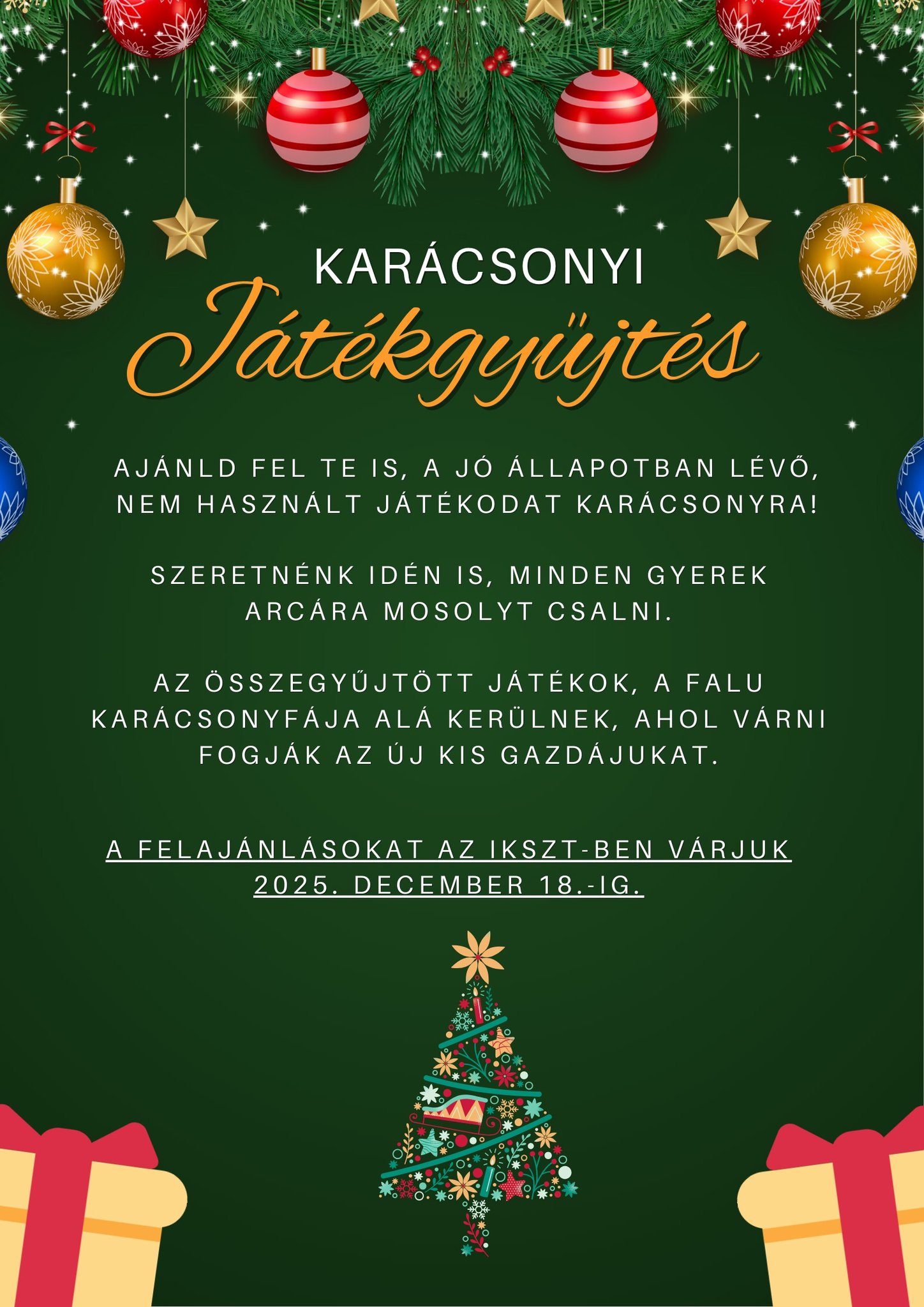 Az sszegyjttt jtkok a falu karcsonyfja al kerlnek, ahol vrni fogjk az j kis gazdjukat.