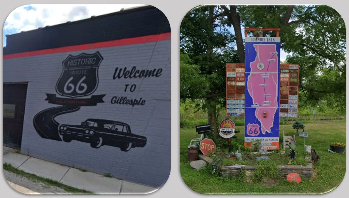 Tovbb haladva Gillespie majd Benld kisvrosn t megy az t. Ezek a teleplsek is a maguk mdjn tisztelegnek az orszg tja felett, klnbz falfestsekkel, valamint Benld dli rszn letrve a 4-es trl egy pillanatra egy emlkhellyel is tallkozhatunk.