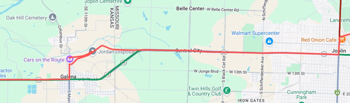 Joplin vrosban a rgi nyomvonal tallkozik a mai napig 66-os szmon fut ttal, gy Missouri llamt, melyet 317 mrfld – 510 km-en keresztl jrtunk vgig a trtnelmi t mentn, ha akarjuk, most tnylegesen a 66-os ton hagyhatjuk el.