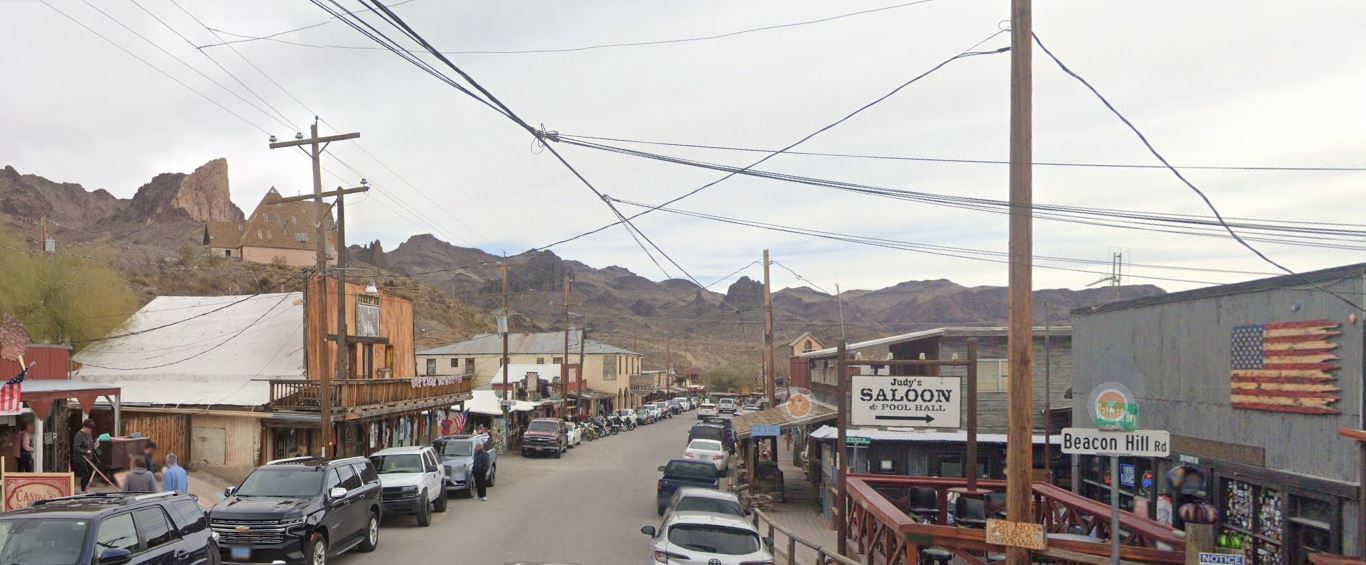 tkellve a hgn, Oatman teleplsre rkeznk. A rendkvl szks t padkjn parkol autk ltvnya, modern vadnyugati rzst kelt helyet idz.