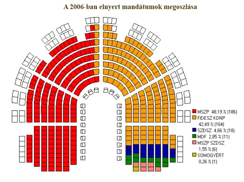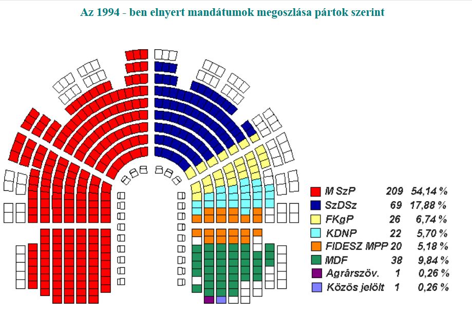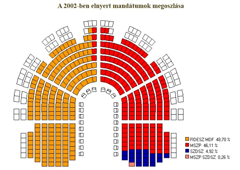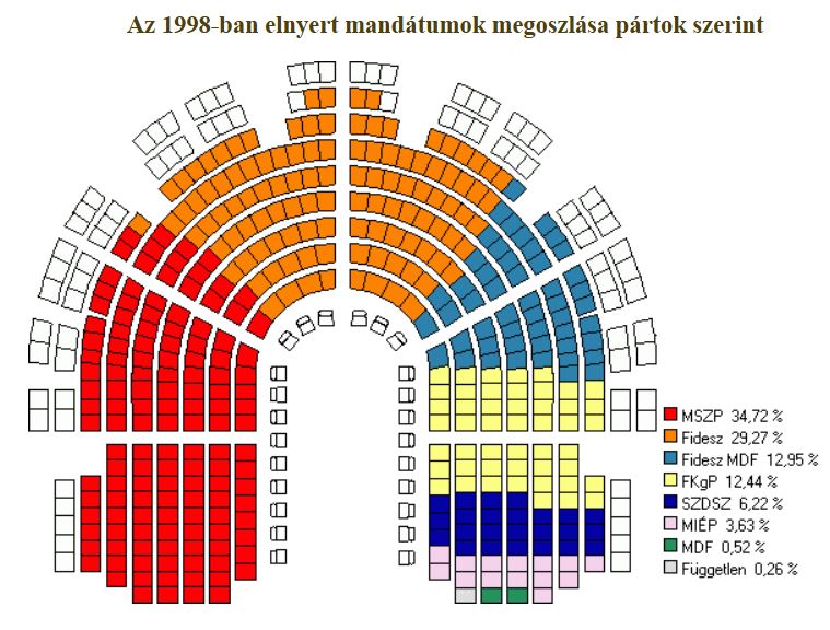 Az ekkorra mr megszokott vl llandan bejut hatprti parlament sszettele megvltozott. Tovbbra is hat frakci alakult az orszggylsben, de ezttal a KDNP kiesett a parlamentbl, helyette a radiklis jobboldali MIP jutott be s tudott kpviselcsoportot alaktani. A rendszervlts legersebb prtja, az MDF is mr csak a FIDESZ-szel sszefogva tudott bekerlni az orszggylsbe.